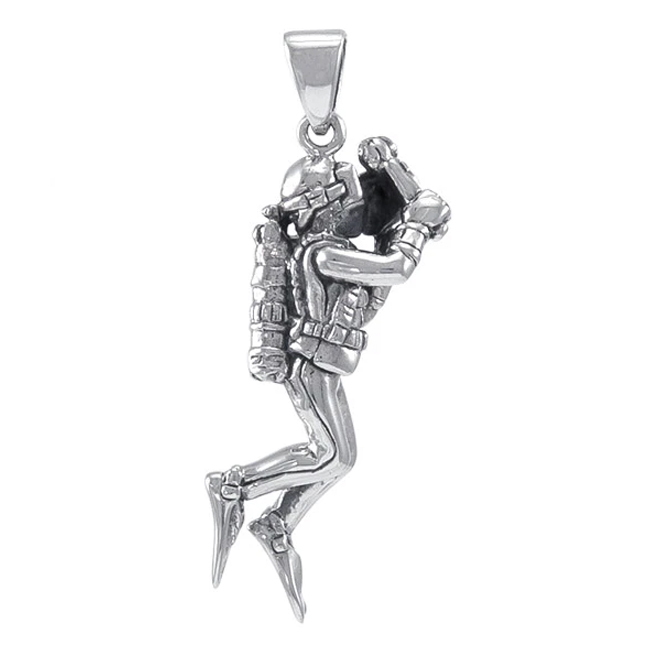 It is a “vertical” version of TP2715, where the diver is horizontal, this design is as if we were diving along a wall or on the side of a Shipwreck like our local King Cruiser Dive Site. This Pendant captures what many divers like best about scuba diving, Underwater Photography. As underwater photographers we are privileged to get to see and record the magical underwater world. This awe-inspiring experience is celebrated in this amazing Sterling Silver Pendant.